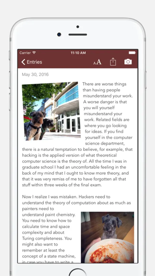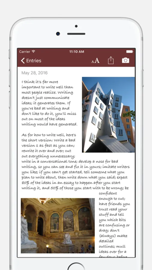 Focused writing. Multiple photos per entry that you can move, resize, rotate - your words flow around them. A recent New York Magazine article cites research showing people experienced improvement in "physical and mental well-being. They were happier, less depressed and less anxious" after writing about emotional or stressful events for a few days.