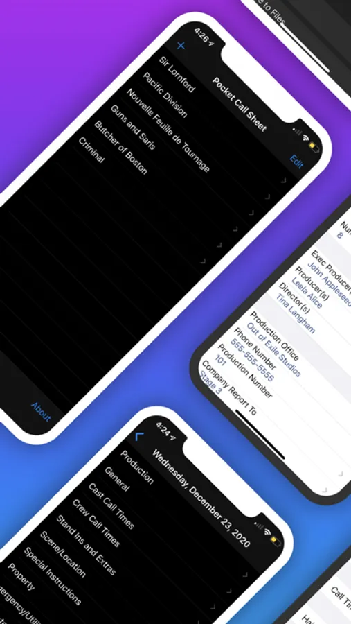 With Pocket Call Sheet you can simply and effectively create industry standard digital call sheets for multiple productions.