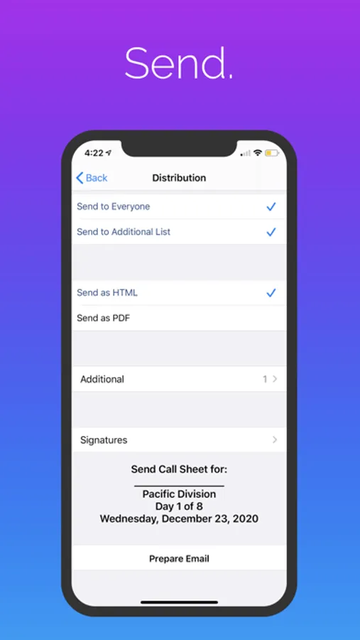 Pocket Call Sheet allows you to email call sheets as HTML or PDF attachments, thus eliminating the need to print.