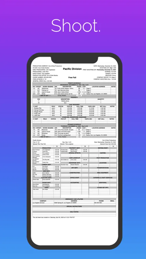 After entering the details of your shoot day, a formatted 2 page call sheet with advance shooting schedule is emailed to all cast, crew and anyone else.