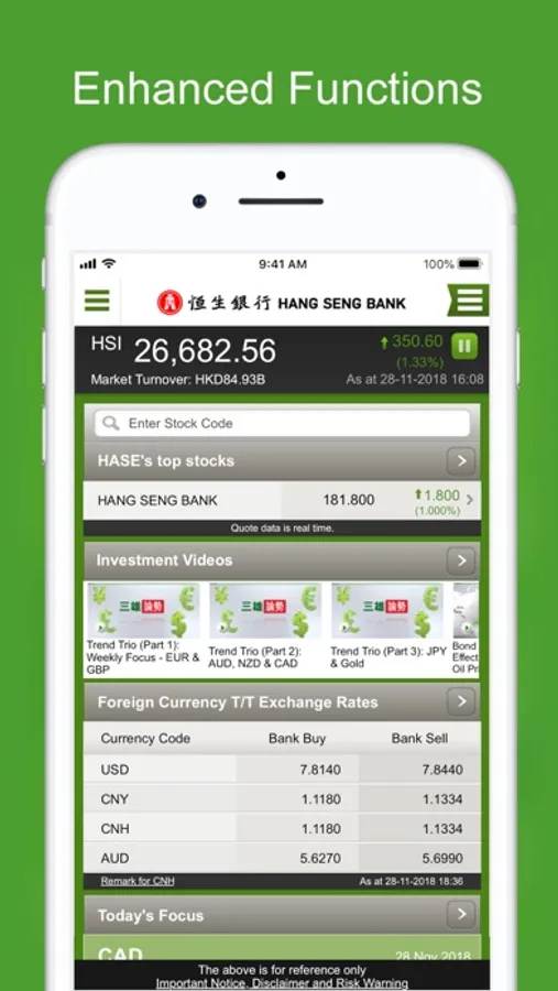 All information and services provided herein are solely for personal and non-commercial use and for general information and reference only. Re-distribution of any part by any means is strictly prohibited. The information provided in this App, including but not limited to general financial and market information, news services and market analysis prepared and/or issued by persons other than the Bank and/ or the Bank (together “Market Information”) contained herein does not intend to and should not be regarded as an offer or solicitation or recommendation to buy or sell any investment products. The information contained herein is for general information and reference purposes only and is not intended to provide professional investment or other advice. It is not intended to form the basis of any investment decision. Persons accessing this App should not make any investment decision based solely on the information and services provided herein. Before making any investment decision, persons accessing this App should take into account his/her own circumstances including but not limited to his/her financial situation, investment experience and investment objectives, and should understand the nature, terms and risks of the relevant investment products. Persons accessing this App should obtain appropriate professional advice where necessary. Hang Seng does not guarantee the accuracy and reliability of the Third Party Information and Market Information provided herein and accepts no liability (whether in tort or contract or otherwise) for any loss or damage arising from any inaccuracies or omission.