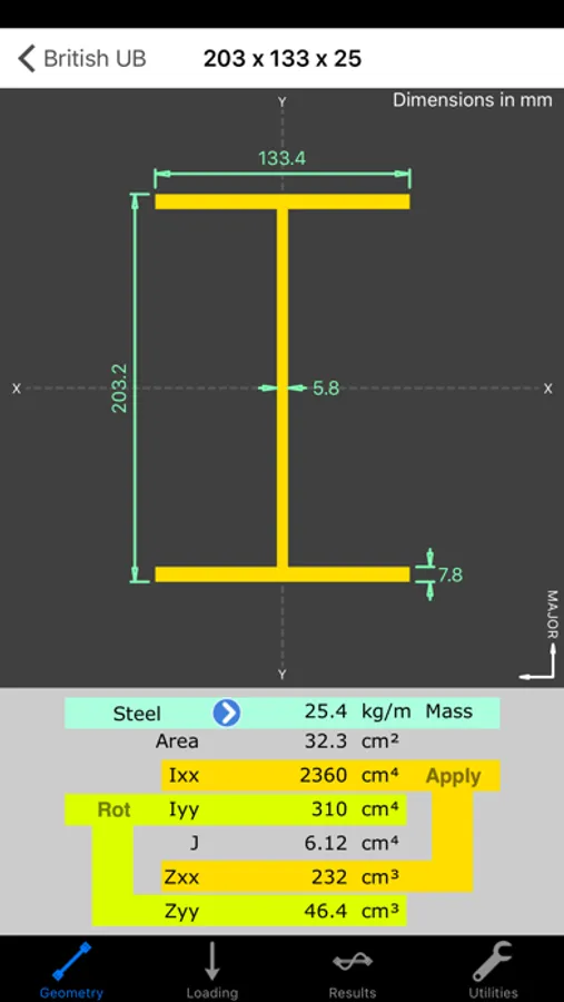 - Calculates: Area, Inertia, Torsional constant, Elastic moduli, mass.