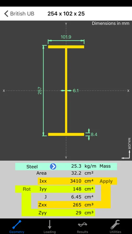 - Calculates: Area, Inertia, Torsional constant, Elastic moduli, mass.