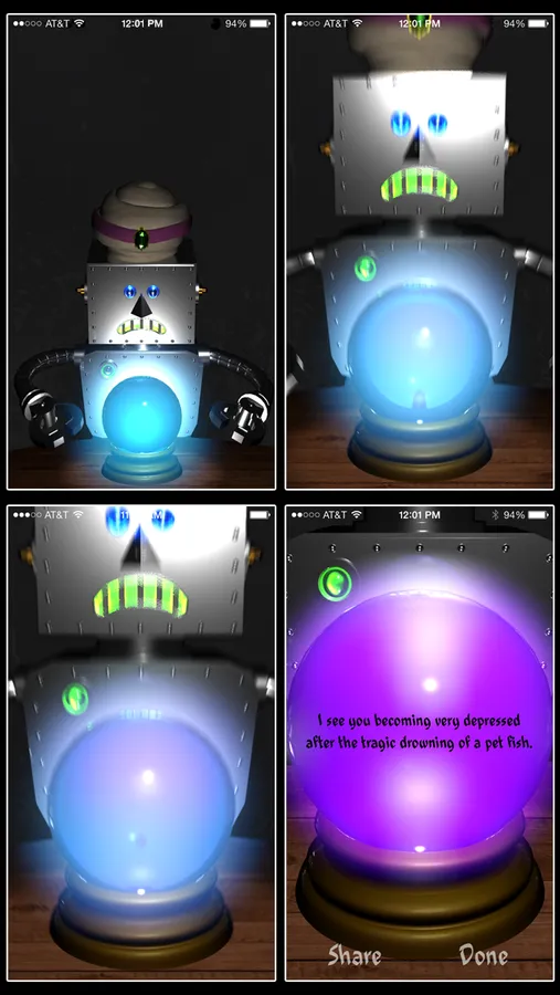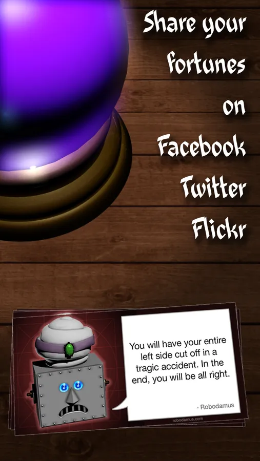 Robodamus is an animated robotic fortune teller for the iPhone, iPod Touch, and iPad. Share your fortunes on Facebook, Twitter, or Flickr to try and convince your friends that you're less boring than you are.