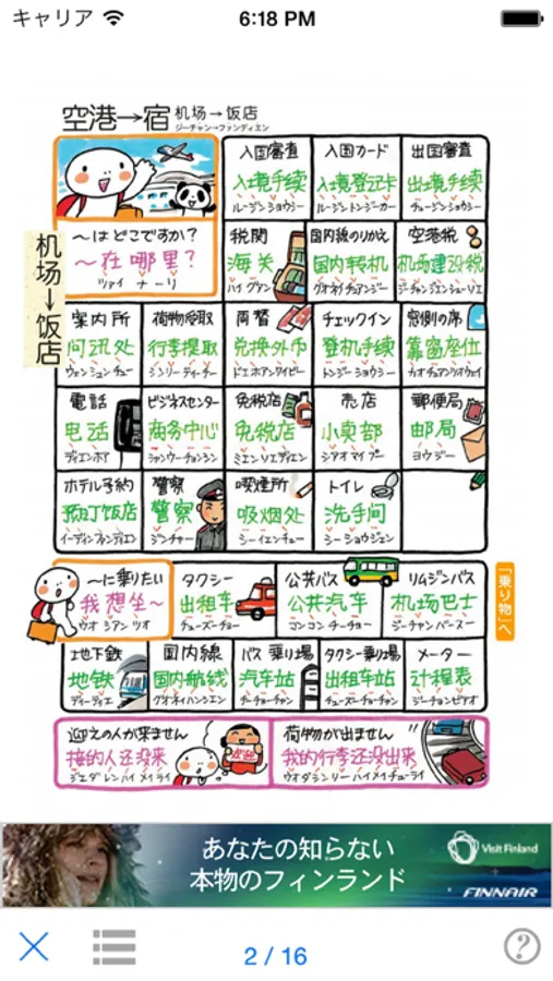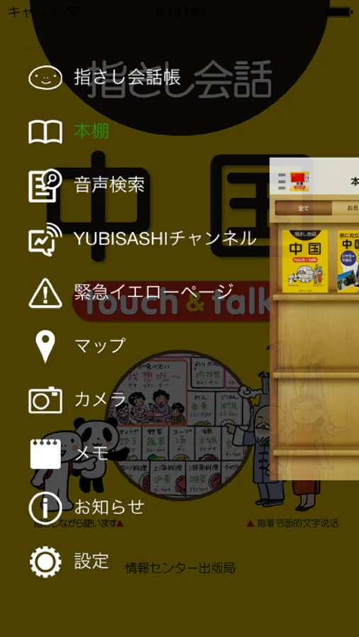 入国時、あいさつ、観光等、カテゴリーがシーンごとに分かれており、タップすると、該当ページに移動できます。