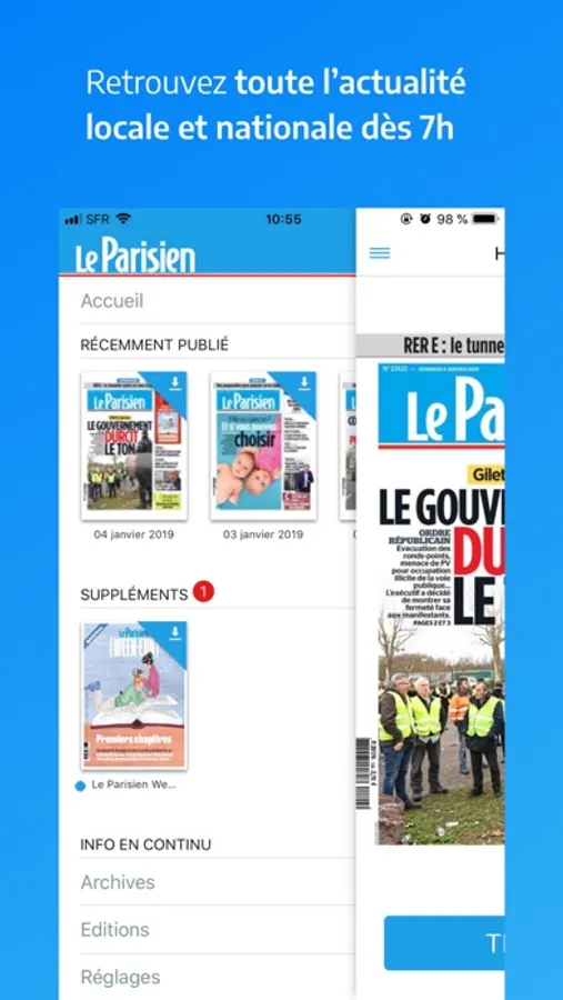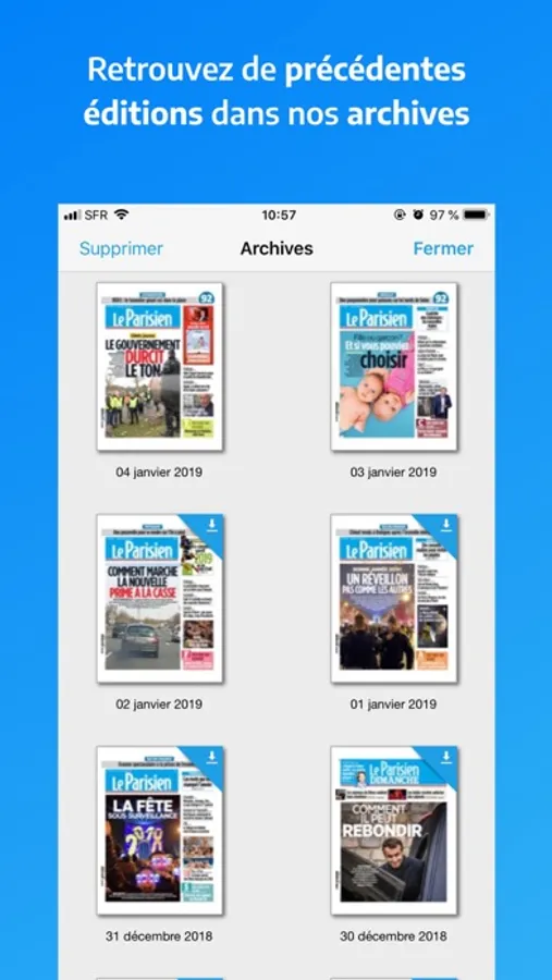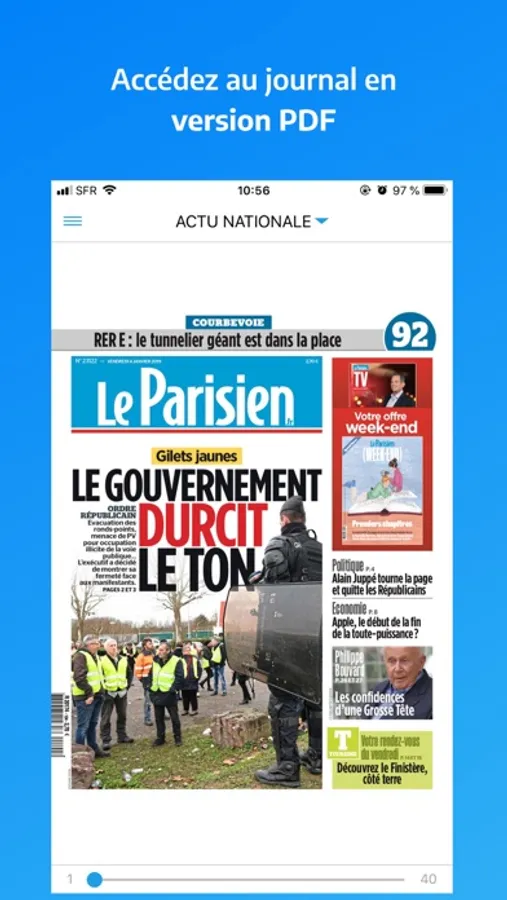 Vous pouvez également acheter l'édition du jour de votre choix et la consulter sur votre iPhone, iPod Touch ou iPad. Pour 1,19€ l'édition, vous lisez votre journal du jour (Le Parisien ou Aujourd’hui en France), vous avez également accès à l’édition départementale de votre choix, aux suppléments hebdomadaires le Parisien Economie et Le Parisien Magazine.