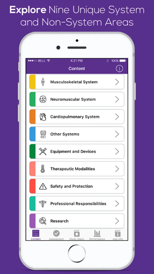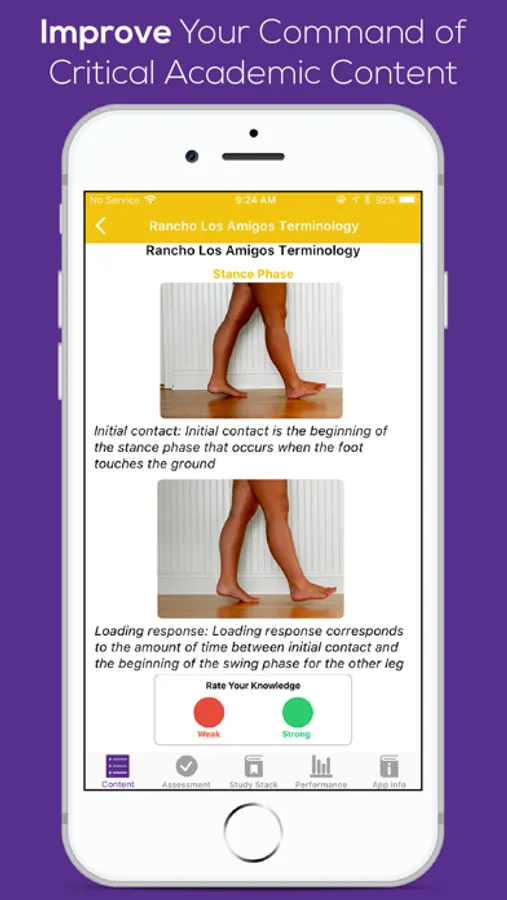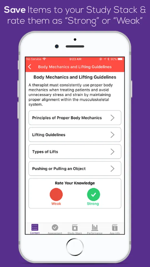 Physical therapist assistants can review selected content by scrolling through subcategories in each of the system and non-system areas. Our innovative design presents academic content in a user-friendly format that allows users to easily digest essential information. Users rate their competence in a variety of topics and create personalized Study Stacks. Study Stacks allow users to efficiently remediate identified academic deficiencies. Frequent review of essential academic content allows users to successfully convert the information to long-term memory.