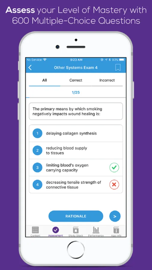 Physical Therapist Assistant Content Master includes an assessment mode that consists of 600 multiple-choice questions. Each multiple-choice question has four unique options and an explanation supporting the correct answer. The multiple-choice questions are designed to assess a user’s mastery of the information presented in the content review mode. The number of questions in each category varies from a minimum of 25 to a maximum of 125. Our Content Tag feature allows users to quickly review questions by topic area (i.e., special tests, cranial nerves, pulmonary function tests).