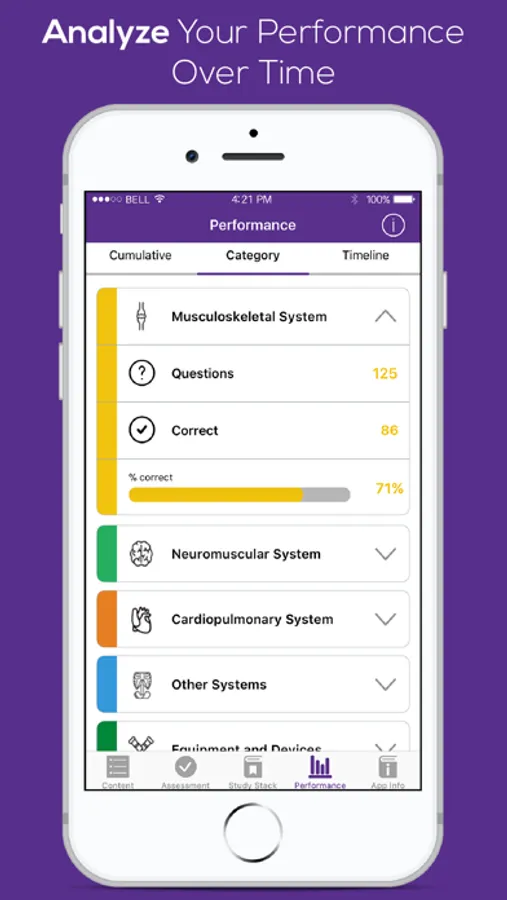 A formal score report describes a physical therapist assistant’s level of mastery cumulatively, by category, and by timeline. Each of the individual reports provides users with valuable performance data to assess their present level of academic mastery. Utilization of the app on a frequent basis considerably strengthens a physical therapist assistant’s knowledge base and provides the necessary foundation to progress to higher level licensing-like questions.