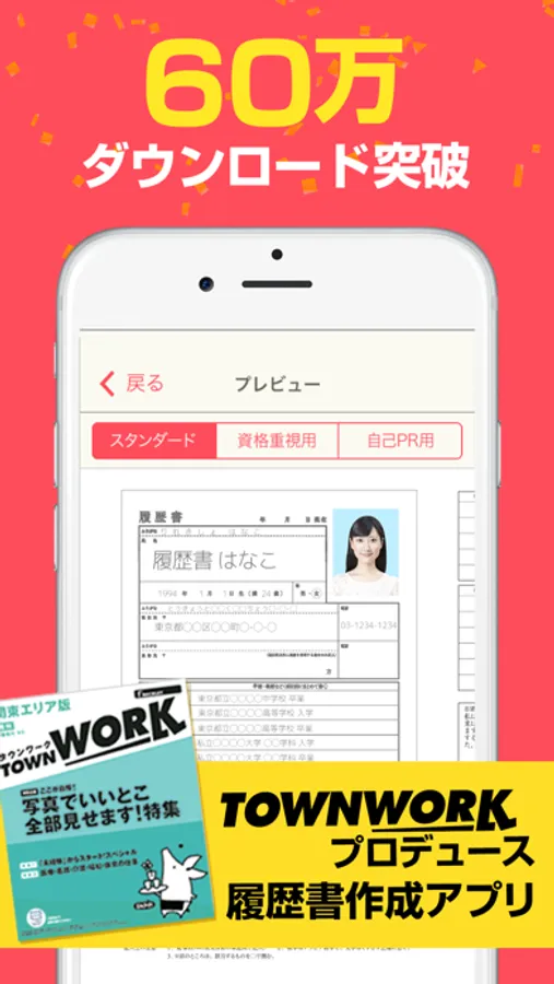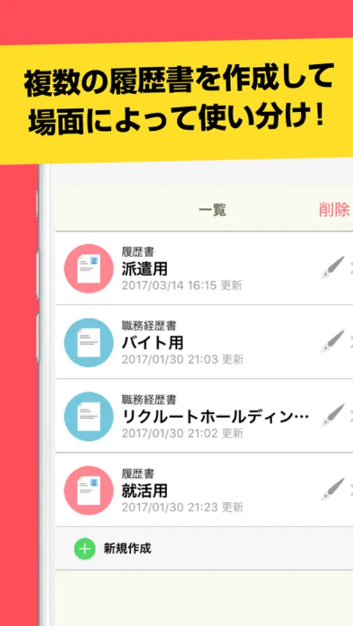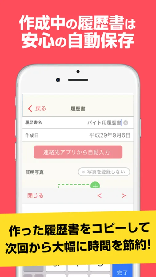 タウンワークがプロデュース!簡単に面接用履歴書・職務経歴書が作成できる無料のアプリができました。「レジュメ」は、履歴書・職務経歴書を記入から写真撮影・印刷までスマホひとつで作成できるアプリです。住所や学歴・職歴が驚くほど簡単に入力できます!さらに志望動機や職務経歴、自己PRは例文集があるので、すらすら文章が書けるようサポートも充実!!