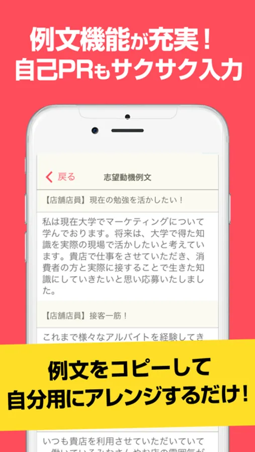 ・悩ましい志望動機や職務経歴、自己PRなども、文面例のテンプレートでサクッと書けちゃう!