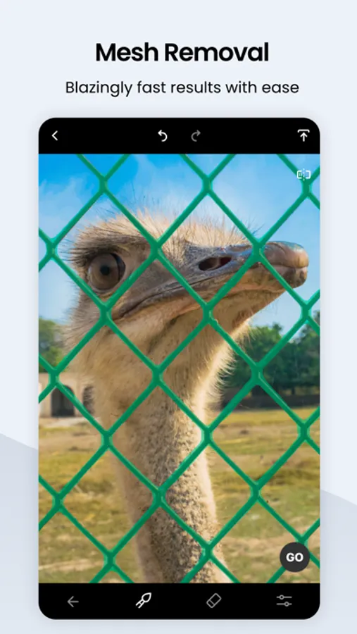 If you think that "getting past the mesh netting" is quite a challenging task, you probably haven’t tried using TouchRetouch yet. The app offers a way to deal with the problem in two simple steps. Select the tool from the main menu and tap the Go button to have the mesh removed just like magic. The whole detection and selection work between these two steps is done by the algorithm; no action is required on your part.