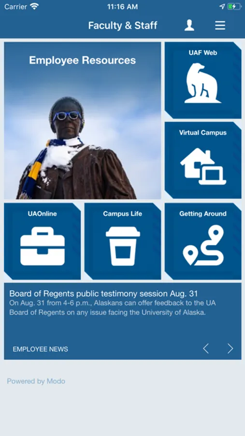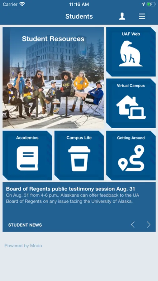 Get the info you need from UAF fast—academics; getting around campus with maps, parking and shuttle tracking; campus life events, activities and news; housing info; dining, menus and locations; health and safety info; social media channels; and more.