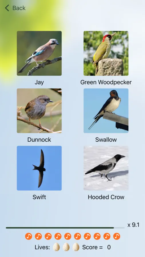 After listening, try the quiz to test your memory. Answer fast to earn a score multiplier and get on the high score table. Experienced birders can use the custom quiz to help distinguish and learn similar songs.