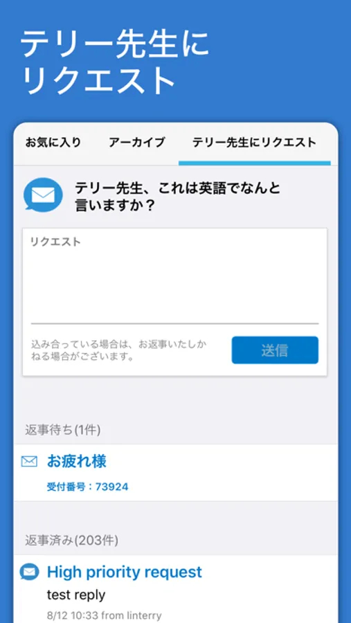 また、知りたいフレーズが掲載されてない場合は「◯◯は英語でなんと言いますか?」とテリー先生にフレーズリクエストで質問しましょう。今まで150,000以上のリクエストに回答して参りました。
