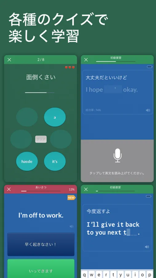 ● 自動再生、音声認識で発音チェック、4種類のクイズ