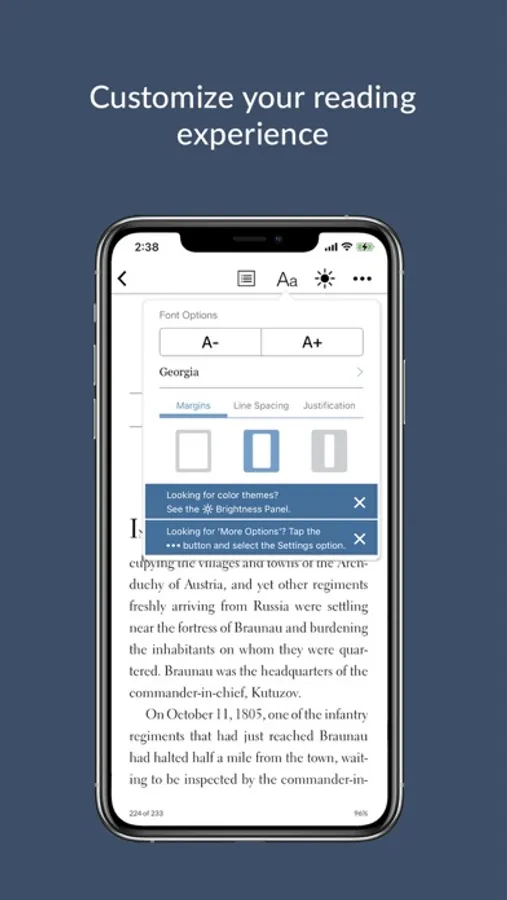 -Adjust font styles, line spacing, margins, page animations, narration speed, background color, and screen brightness for more comfortable reading.