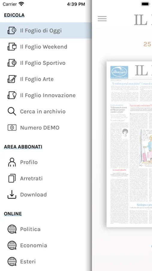 Il Foglio, diretto da Claudio Cerasa, poche pagine per tanti contenuti. Approfondimenti, inchieste, news analysis, ritratti, opinioni controcorrente e pesanti come l'Elefantino che lo ha fondato, Giuliano Ferrara. Ogni weekend un inserto di dodici pagine con grandi firme e foto d'autore, un numero monografico ogni lunedì e inserti speciali durante la settimana. Il giornale più sexy in circolazione.