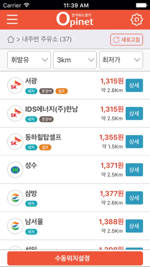 제품별 판매가격, 부가 서비스(세차, 셀프, 행사 등), 위치 등 상세정보를 확인 하실 수 있으며, 지역별 주유소, 경로별 주유소, 가짜석유 주유소 찾기 등 다양한 형태의 서비스를 제공합니다.