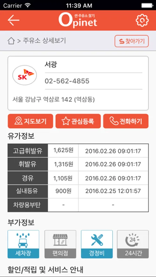 ▪ 주유소의 주소, 전화번호를 포함하여 세차, 경정비 등 부대시설과 할인행사 정보 제공