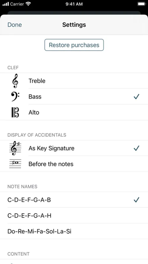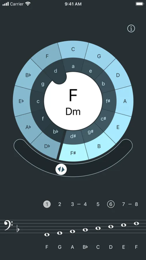 A key in the circle can be selected either by touching the tonic or by turning the slider in the middle. The circle displays both the respective major and parallel minor scales. The display ranges from F-flat major (D-flat minor) to G-sharp major (E-sharp minor). A second slider can be used to move the visible circle section accordingly.