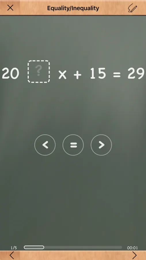 - Generates simple equations, as well as single step algebraic equations. (e.g. 6+x=12; x-8=2; 5x=25).