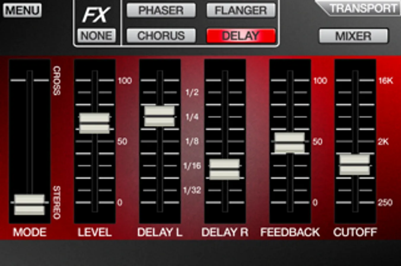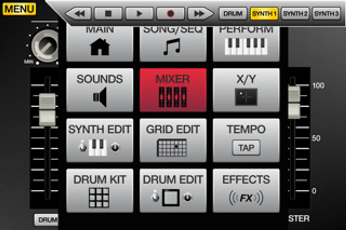 The Mixer in SynthStation includes touch-controlled faders for each of the three synthesizers and the drum section as well as FX send for each.