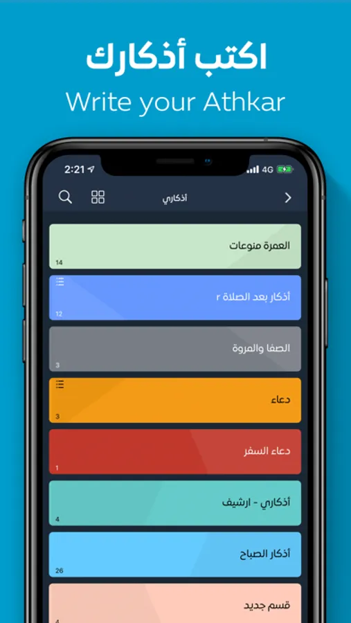 Create your own Athkar / Azkar and get notifications for any athkar you created.