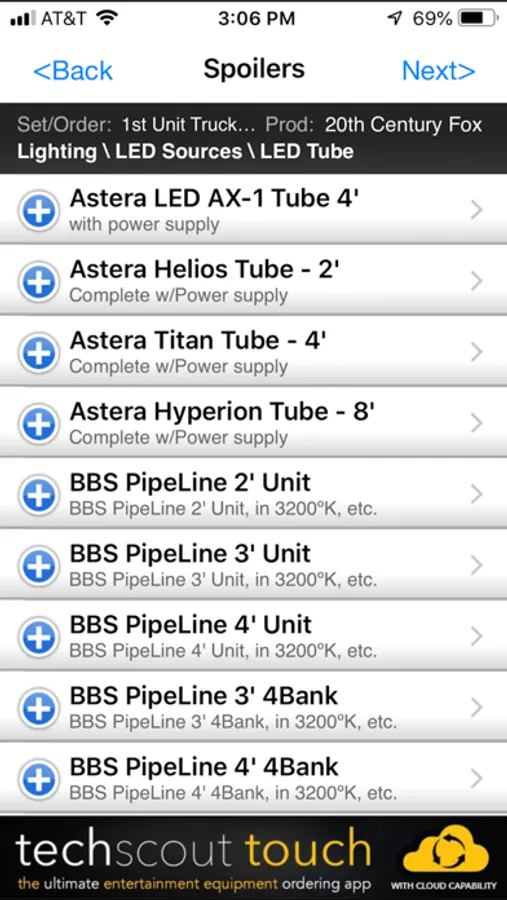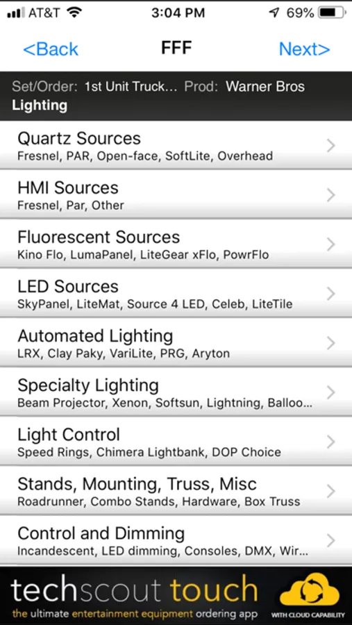 TechScout Touch is designed for lighting professionals in the Movie, TV, Commercial, and Video production industry. The app helps you to create lighting equipment rental orders which can be submitted to rental houses or studio Set Lighting or Grip Departments. The latest version features a highly improved interface, cloud syncing, and a curated lighting and grip equipment lists of over 6,000 items. These items are arranged into hundreds of categories and subcategories making your equipment list easy to read and simple to understand. Can’t remember what category an item is in? Just use the newly added search feature to display an editable list of the gear you are looking for.