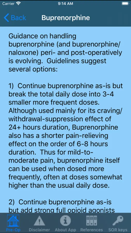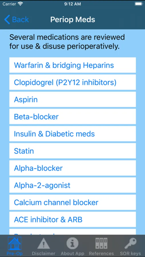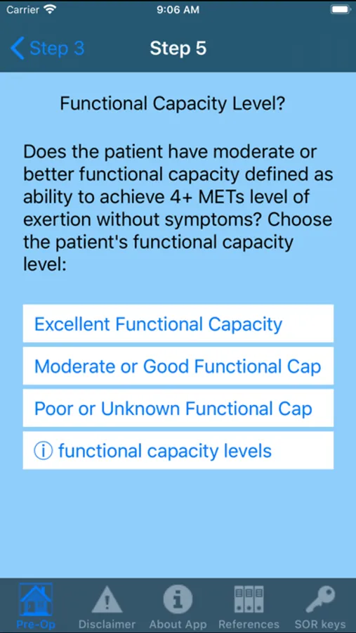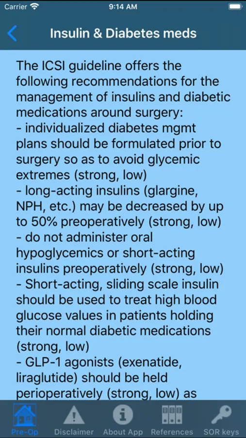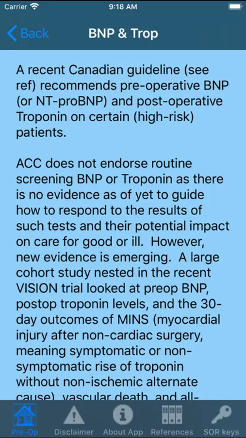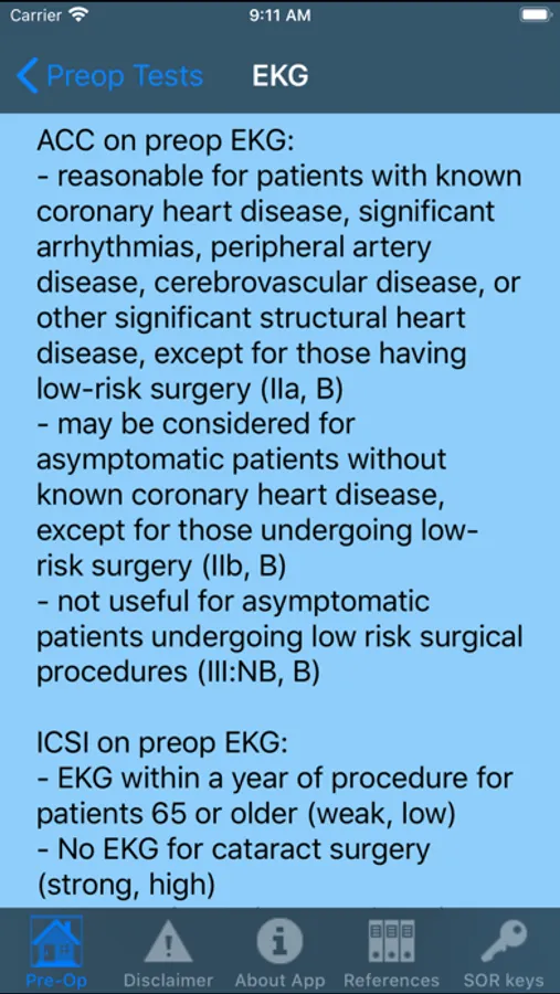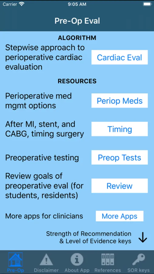 Description: Preop Eval organizes and presents much of the guidance that one needs in order to evaluate and prepare adult patients for non-cardiac surgery. It is based upon the guidelines on this topic from the American College of Cardiology of 2014, the European Society of Anaesthesiology of 2011, the American Society of Anesthesiologists 2012, the Institute for Clinical Systems Improvement of 2014, the American College of Chest Physicians of 2008 & 2012, and more (full references in the app). The app contains 1 algorithm and 3 resources: the cardiac evaluation algorithm, guidance on starting and stopping key medications in the perioperative period, guidance on timing of surgery after cardiac events, and guidance on preoperative testing. It also contains a review of preoperative evaluation mainly for students and residents.