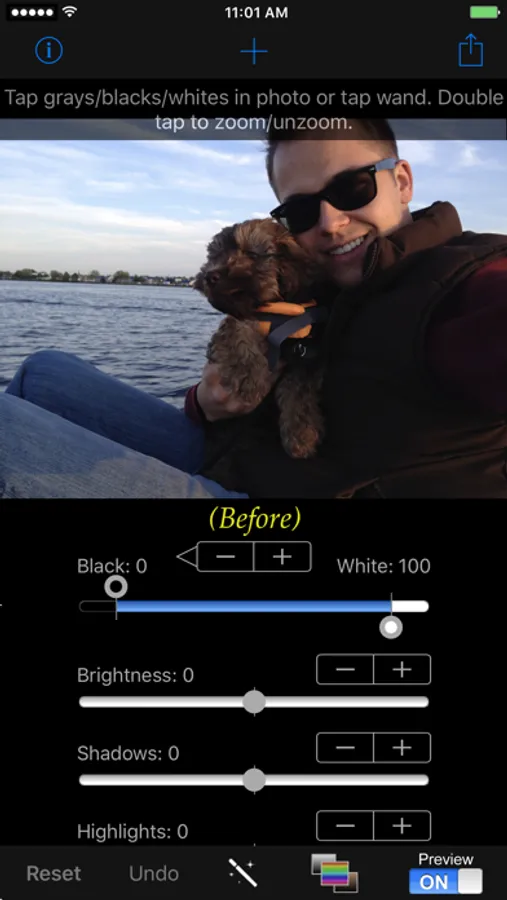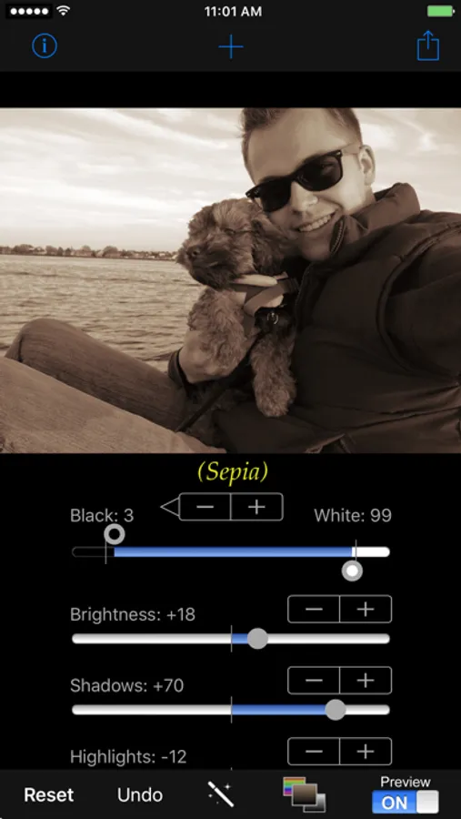 • Fine tune the automatic correction using sliders and steppers to independently adjust overall brightness, shadows, highlights, contrast, saturation, tint and temperature. You will be amazed at the shadow detail that can be recovered in backlit images.