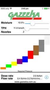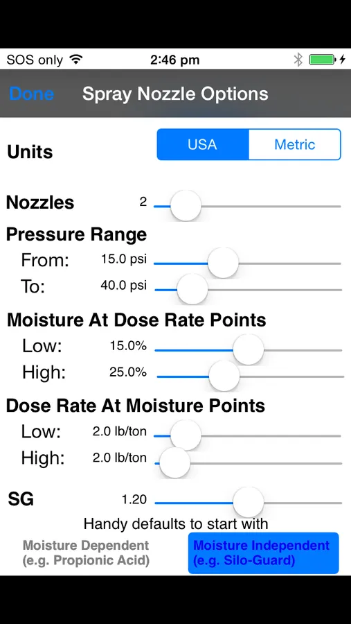 This application would typically be used by hay baler operators who add a liquid preservative to their hay at the pickup section of their hay baler. The App is designed to provide the hay baler operator with what size nozzle (determined internationally by the color) and at what pressure to operate that color nozzle(s) to accurately add the correct amount of preservative. The information about the operating condition and dose rate entered into the Application's options screen and the moisture and tons per hour (TPH) in the main screen will determine the nozzle color and pressure.