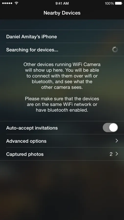 WiFi Camera will allow you to connect two iOS devices wirelessly. You will be able to receive and transmit the camera view with the other device, in addition to sending photo capture requests, which will take a full-resolution photo on the receiving device, transfer it to the requesting device, and save the photo on both devices.