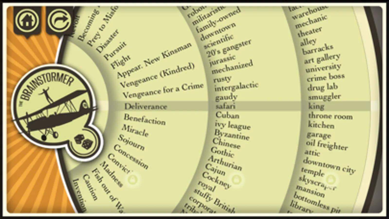 The Brainstormer has three spinning wheels featuring plot/conflict, theme/setting and subject/location. By manipulating the wheels -- or do a random spin -- you generate combinations that make fantastic creative prompts for writing, sketching or any creative activity. Edit the wheels: tweak the built in lists or create entirely new scenarios from scratch.