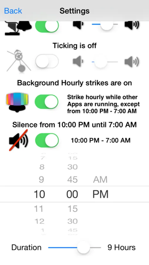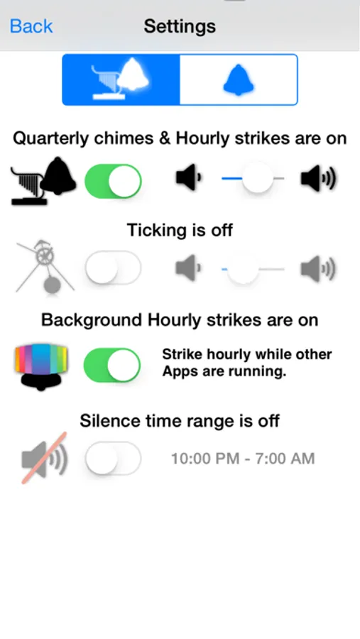 Slide your finger or tap a button to turn On / Off and set the volume level of the quarterly chimes, hourly strikes, and the ticking.