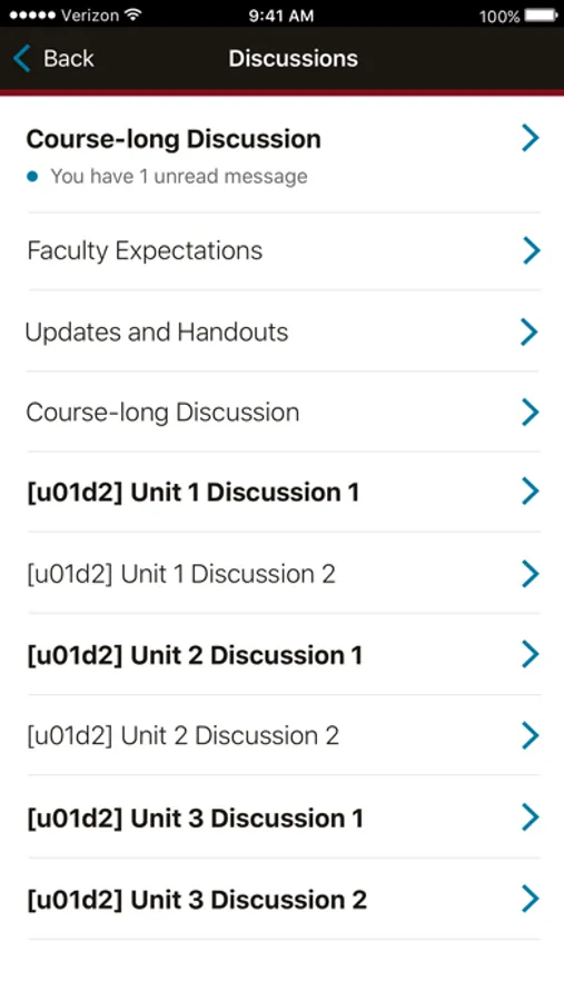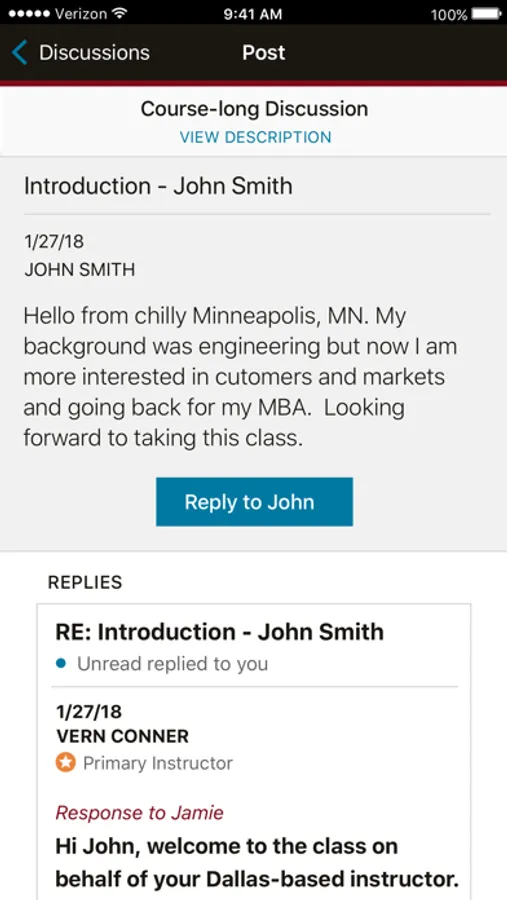 * Post to course discussions; read and reply to classmates' or faculty postings