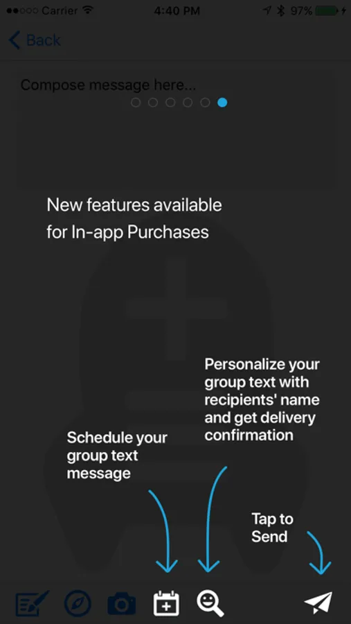 -Schedule your messages (In-app Purchase) - Set reminders for your text messages that need to go out on time. Press Send after tapping reminder.