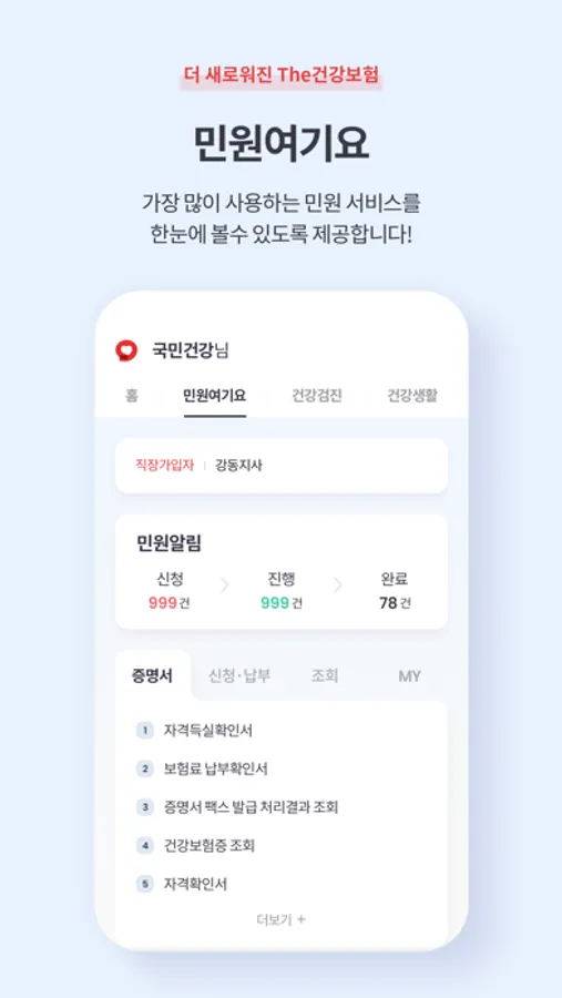 - 자격득실확인서, 보험료 납부확인서 등 증명서 5종을 제출기관에 팩스로 보낼 수 있습니다.