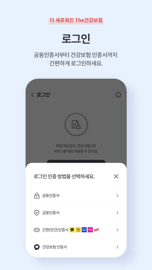 - 공동, 금융, 민간, 건강보험 인증서 등 8종의 다양한 로그인 방식으로 이용할 수 있습니다.