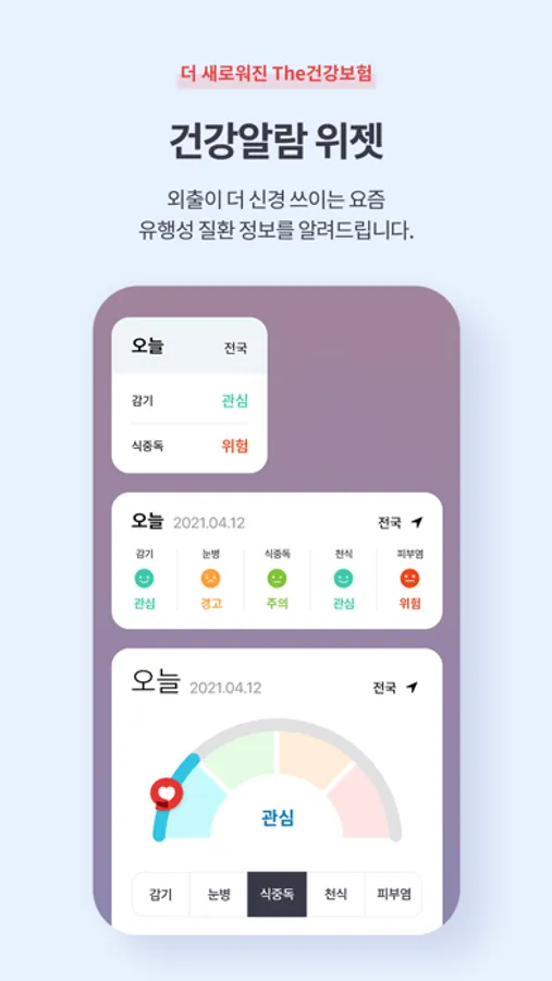 - 주요 질환별 지역별 위험도를 알려주는 건강알람정보를 위젯으로 설정할 수 있습니다.