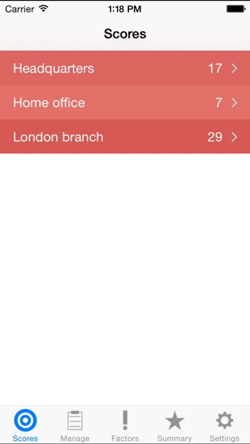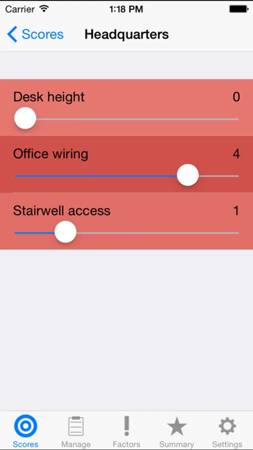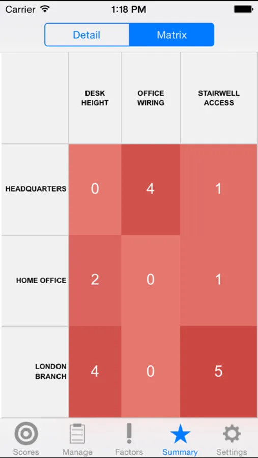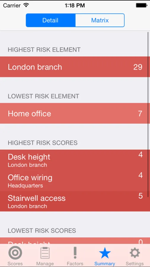 Add elements you wish to assess, home office and London office and give them a score for each factor, if the stairwell is very clear give it a low risk score if the wires are snaking throughout the office give it a high score.