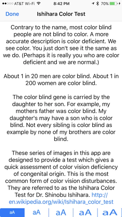 These series of images in this app are designed to provide a test which gives a quick assessment of color vision deficiency of congenital origin. This is the most common form of color vision disturbances. They are referred to as the Ishihara for Dr. Shinobu Ishihara (http://en.wikipedia.org/wiki/Ishihara_color_test).