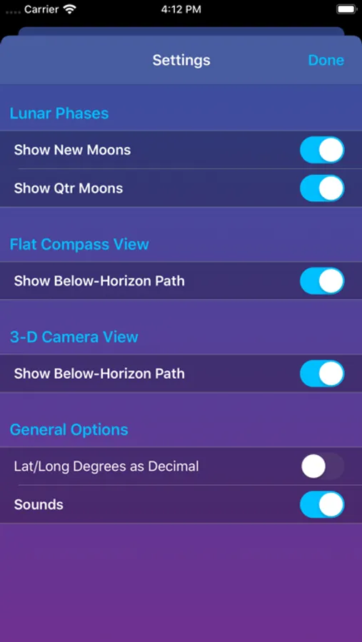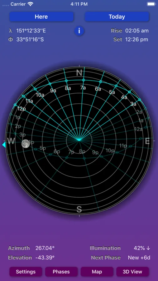 * Uses GPS and magnetometer to find the correct lunar position and path for your current location, or for any location on earth