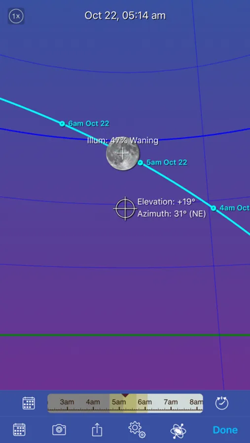 * 3D augmented reality camera overlay view showing the moon's current position, its path with hour points marked