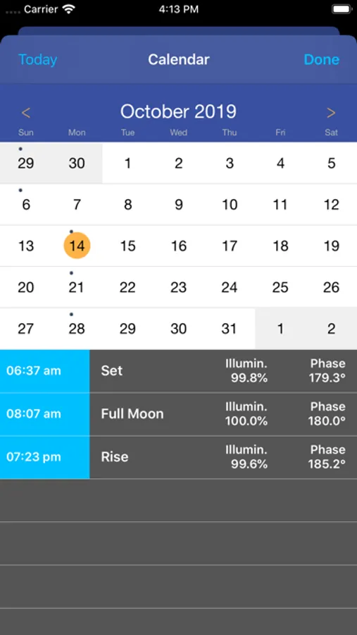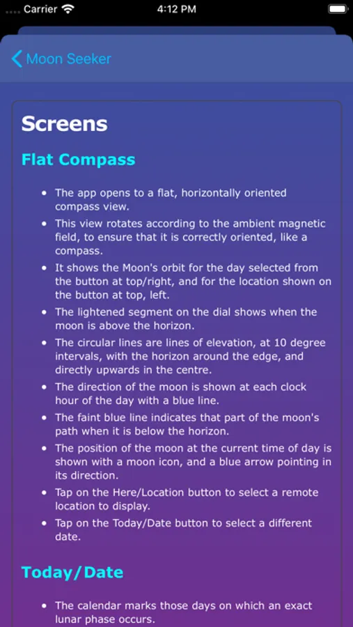 Provides a list of LUNAR PHASES, a CALENDAR view, a FLAT VIEW COMPASS, a MAP VIEW and an AUGMENTED REALITY CAMERA 3-D VIEW showing the lunar path and its hour intervals.