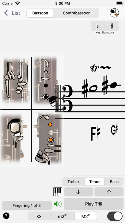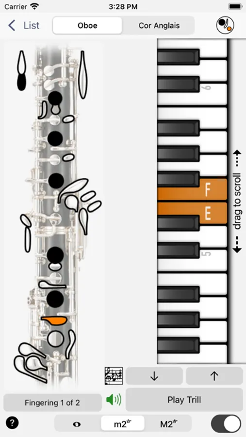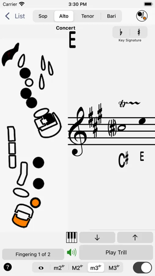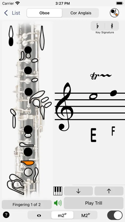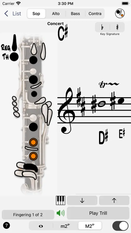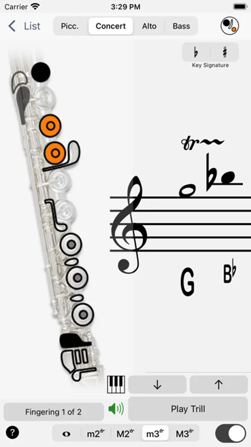 • If there are alternate fingerings available for a note or trill, a button will allow you to navigate through them.