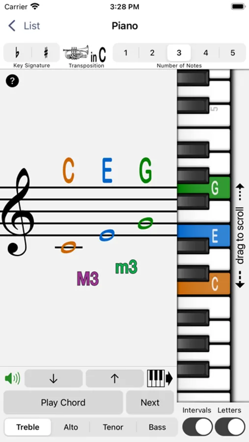 The 'Piano' instrument simultaneously displays the note names, the locations on the piano, and the musical notations of up to 5 pitches in either Treble, Alto, Tenor or Bass clef. The Notation can be transposed for most all instrumental transpositions.