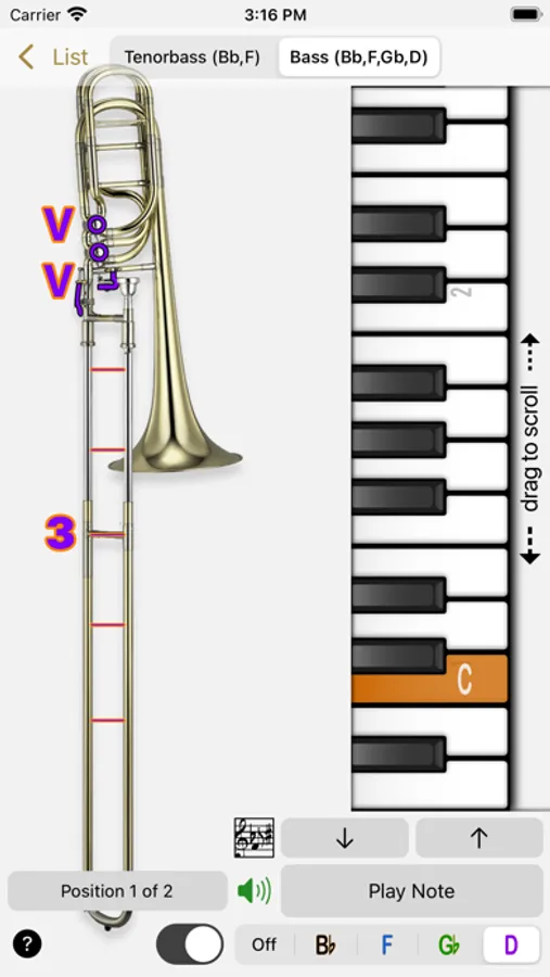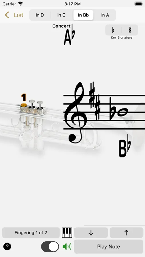 • If there are alternate fingerings available for a note, a button will allow you to navigate through them.