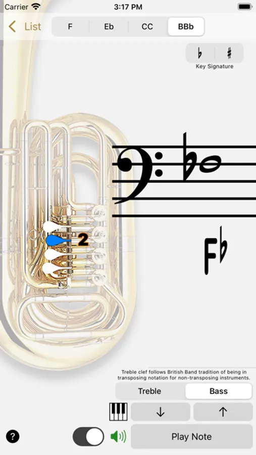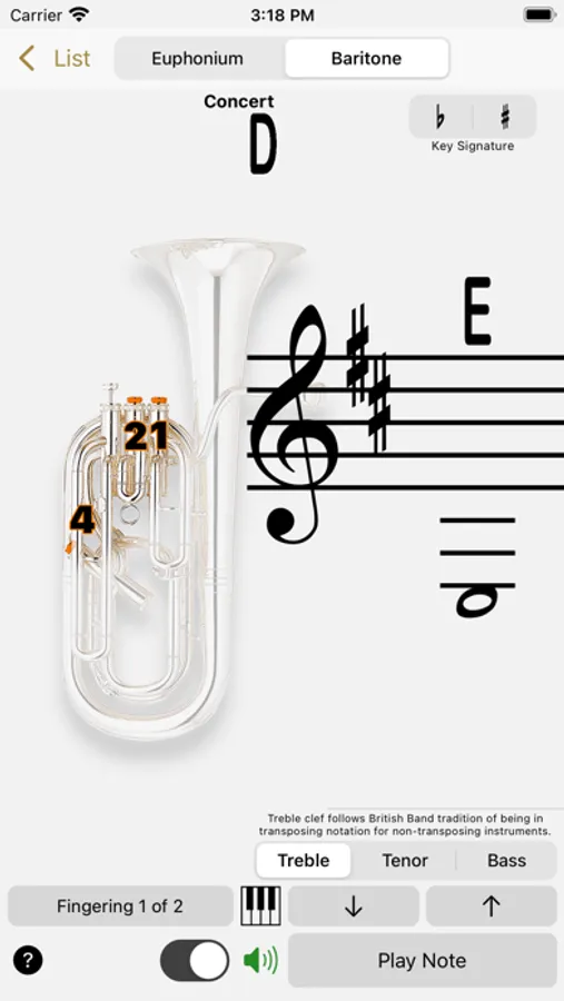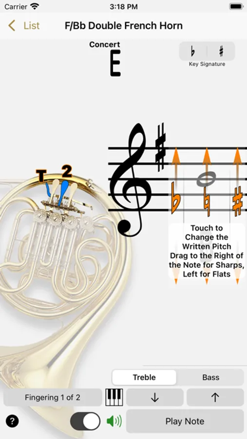 Pick a written note (touch the staff) and have the fingering displayed and concert pitch played. Touch a button and reveal the note on the piano.