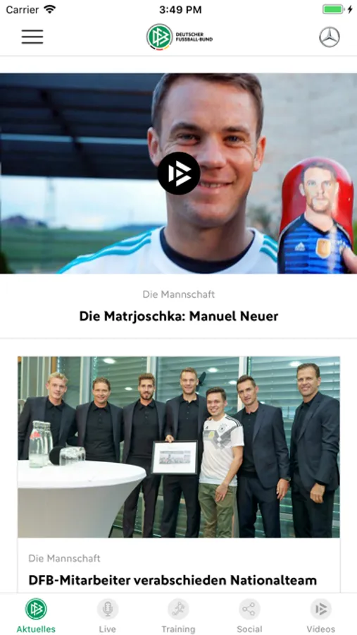 Die DFB-App bietet Dir einen Knaller nach dem anderen. Mit dem riesigen Videobereich entgeht Dir keine DFB-Veranstaltung. Ob Highlight-Berichte der Länderspiele, Zusammenfassungen der Spiele um den DFB-Pokal, das Beste aus der 3. Liga, die Junioren-Bundesliga, die Frauen-Bundesliga oder die sozialen Aktivitäten. Mit dieser App hast Du nicht nur das Gefühl live dabei zu sein – Du bist es tatsächlich. Denn über die DFB-App sind auch die Live-Events des Videokanals DFB-TV verfügbar. Und mit den Videos aus den Quartieren der deutschen Nationalmannschaften wird jedes Länderspiel für Dich zu einer einzigartigen Erfahrung. Per Video ziehst Du mit Manuel Neuer, Mario Götze, Alexandra Popp oder Simone Laudehr ein in die Teamhotels der A- und der Frauen-Nationalmannschaft.